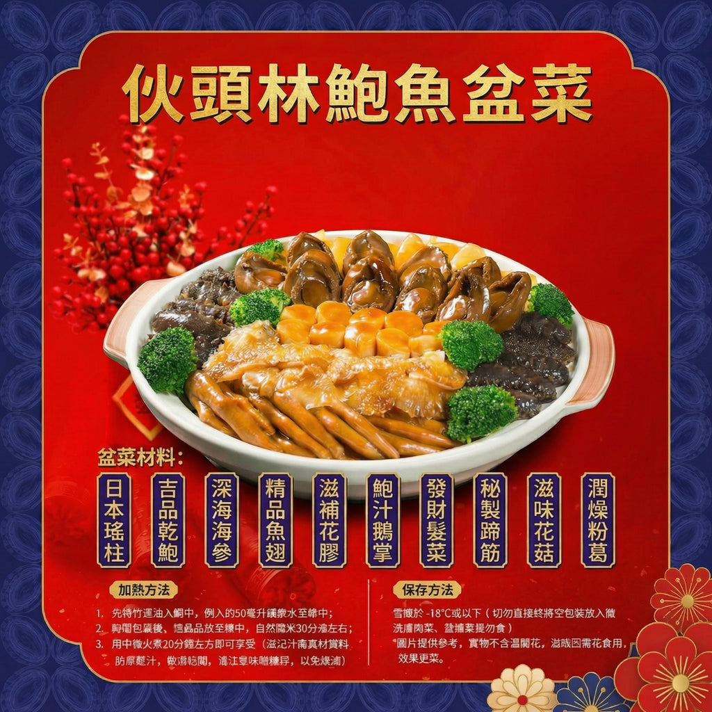 伙頭林鮑魚大盆菜 (10人/6人/4人份) Chef Lam's Abalone Deluxe Poon Choi (For 10/6/4 persons)